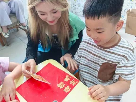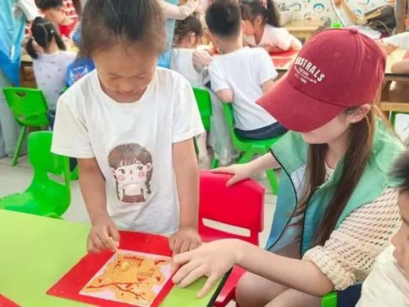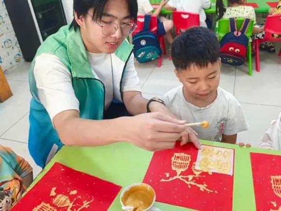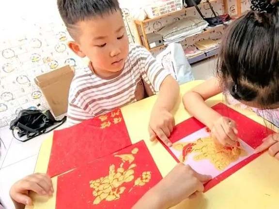 教學過程中,志愿者們通過有趣的故事講述拓印的起源,詳細介紹其獨特藝術特點,隨后逐步演示拓印制作的具體步驟,同時分享非遺傳承的重要意義,讓小朋友們對拓印有了全面認識。演示結束后,志愿者與幼兒園老師一起準備好宣紙、金粉、海綿刷等工具材料。在志愿者的耐心指導下,小朋友們小心翼翼地將宣紙覆蓋在模板上,用工具輕輕敲打,使紙與模板緊密貼合,然后用海綿刷蘸取金粉均勻涂抹,一幅幅精美的拓印畫逐漸呈現。