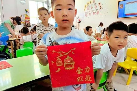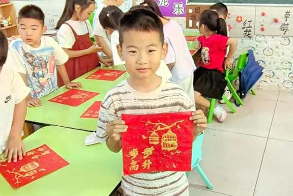 值得一提的是,高考即將到來,志愿者們準備了帶有花草和祝福語的模板,小朋友們滿懷熱忱,將美好的祝愿融入拓印之中,希望通過自己親手制作的作品為廣大考生送上祝福。