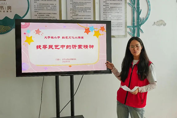 團隊來到蒙陰街道疊翠社區,為小朋友們開展“找尋民藝中的沂蒙精神——大手拉小手,紅色文化小課堂”。隊員們通過《沂蒙山小調》這一耳熟能詳的歌曲切入主題,向小朋友們講述了“黨群同心、軍民情深、水乳交融、生死與共”的沂蒙精神深刻內涵;結合自身專業,用多姿多彩的圖片讓小朋友們認識到常見的沂蒙民藝形式;把沂蒙剪紙、臨沭柳編、沂蒙手繡等傳統民藝與沂蒙精神相結合,講述民藝作為傳承沂蒙精神的藝術載體所發揮的重要作用。隊員們帶領孩子們動手體驗用黏土與繪畫表達“我心中的沂蒙情”,運用簡單易懂的方式讓沂蒙精神從“聽說”變為“觸摸”,在孩子們心中種下傳承的種子。