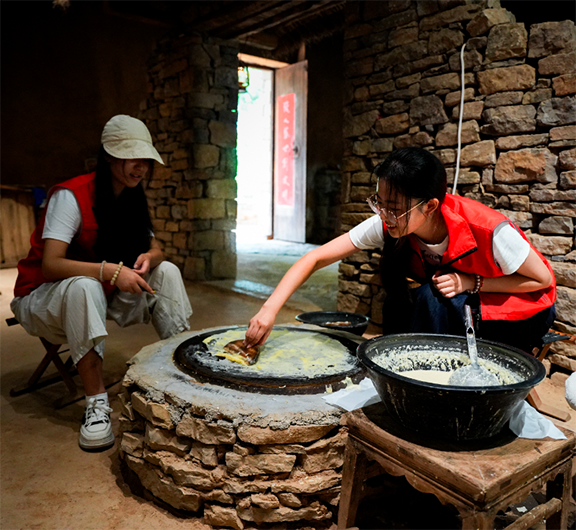 隨后,團隊來到蒙陰街道,見到了因“煎餅花”走紅的“常路大嫂”徐海霞。在她的工作室里,原本卷著咸菜的家常煎餅,被做成了牡丹、玫瑰等造型的“花束”。“俺們沂蒙人愛吃煎餅,可年輕人總覺得土?!睆垚廴A笑著說,一次偶然的機會,嘗試了三個月,她才將煎餅做成像樣子的花瓣形狀。團隊在徐老師的指導下,上手學習最基礎的玫瑰花瓣,驚嘆于普通食材的藝術蛻變,了解到其中每一個轉折、每一處細節都是通過一次次的實踐試驗出最完美的手法。她告訴團隊,煎餅在革命戰爭年代曾是八路軍的“行軍糧”,如今通過創新形態,既能讓年輕人重新愛上傳統美食,也能讓更多人通過這道“花餑餑”了解沂蒙精神。“不變的是煎餅的實在,變的是讓它走得更遠的法子?!毙炖蠋煹脑挘莱隽藗鹘y技藝在當代傳承的密碼——守正創新。