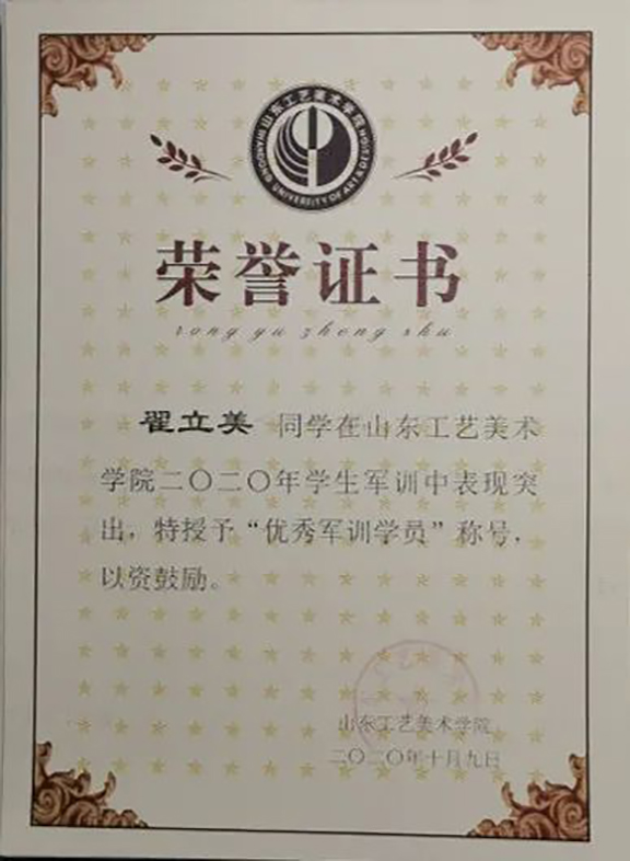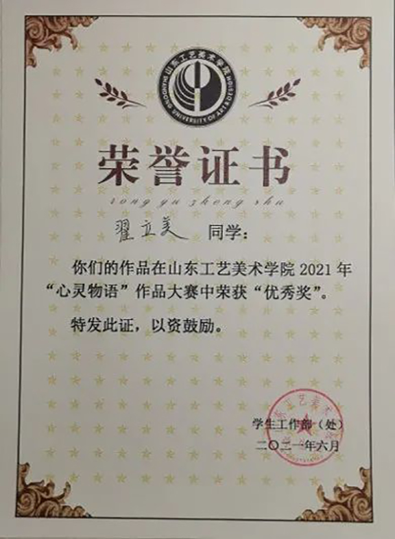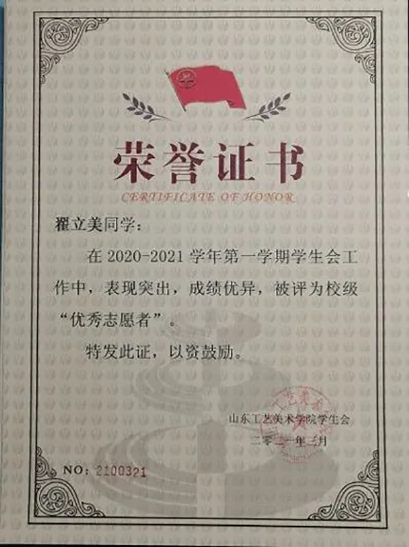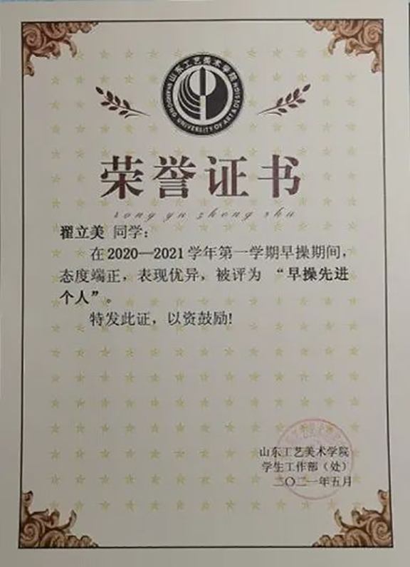 翟立美在學習期間態度端正、目標明確,于2020—2021大一學年成績優異,以綜合第一的成績榮獲校級一等獎學金。