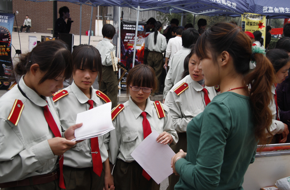 宣傳活動剛開始,許多同學前來詢問,并提出了他們的疑惑,如,勤工助學屬于什么部門,如何報名,其中的崗位是怎么設置的等一系列問題。勤工助學組各負責干事耐心的對此作了詳細解答,并為他們分發《大學生勤工助學工作手冊》,并告知他們如果想了解更詳細的情況,可以在本月的27、28日下午5:00到綜合辦公樓二樓勤工助學辦公室做進一步咨詢。活動期間,同學們踴躍咨詢,使得現場氣氛十分活躍。