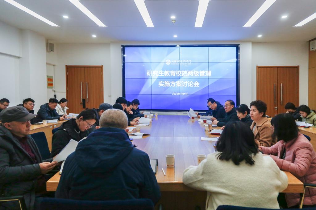 3月1日,學(xué)校在長(zhǎng)清校區(qū)召開研究生教育校院兩級(jí)管理實(shí)施方案討論會(huì)。院長(zhǎng)董占軍,副院長(zhǎng)張艷霞,黨委委員、統(tǒng)戰(zhàn)部部長(zhǎng)、人事處處長(zhǎng)安峰出席會(huì)議。張艷霞主持會(huì)議。