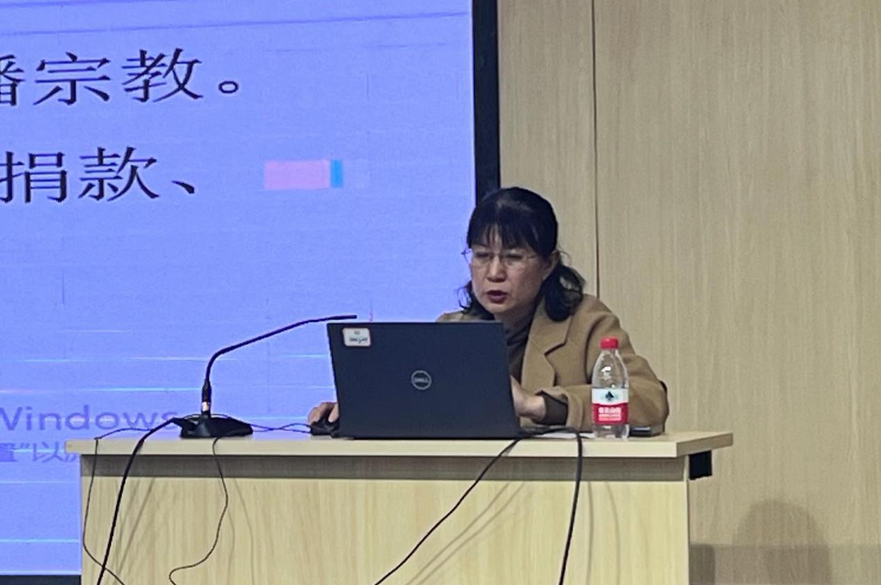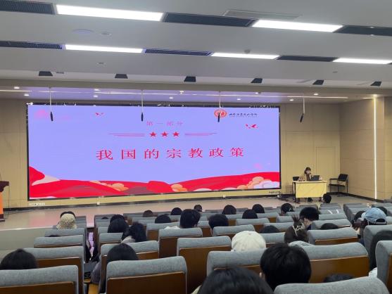 講座第二部分,李蓉書記以“學習宗教政策,抵制非法傳教”為題,向在場同學介紹了我國的宗教政策、非法宗教和邪教的界定以及危害。以真實案例勸誡同學們正確對待宗教問題,倡導新時代科學的學習生活方式,彰顯新時代青年的活力與朝氣。