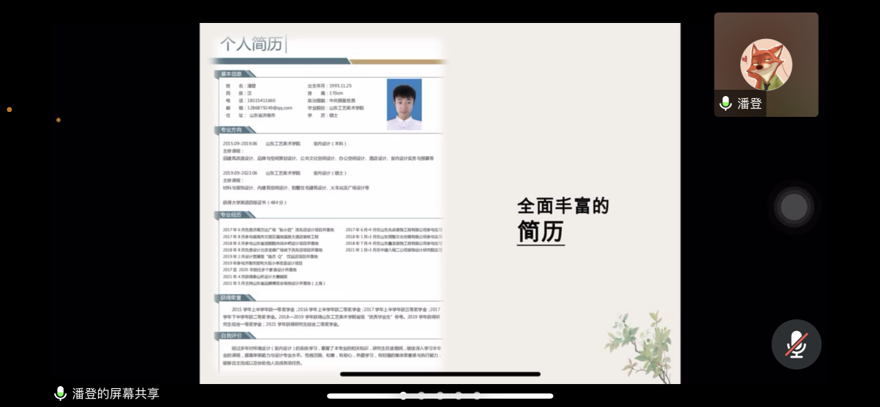 潘登系我校2019級(jí)藝術(shù)設(shè)計(jì)專業(yè)環(huán)境設(shè)計(jì)方向畢業(yè)生,現(xiàn)就職于中建八局二公司設(shè)計(jì)院。在交流會(huì)上,潘登圍繞畢業(yè)季職業(yè)規(guī)劃、就業(yè)方向選擇、應(yīng)聘簡(jiǎn)歷制作、作品集裝訂和求職應(yīng)試五個(gè)方面進(jìn)行分享,并和與會(huì)同學(xué)展開充分交流。