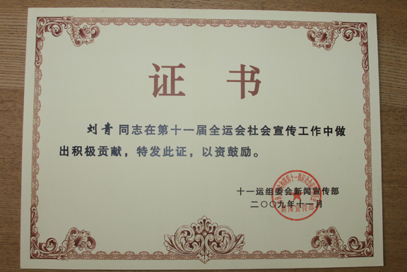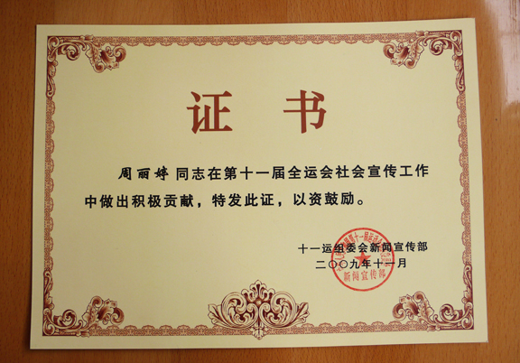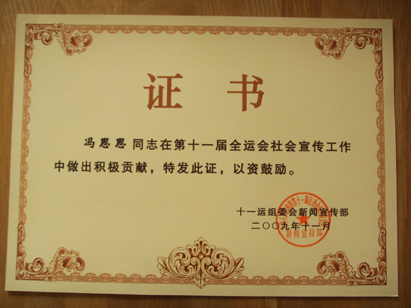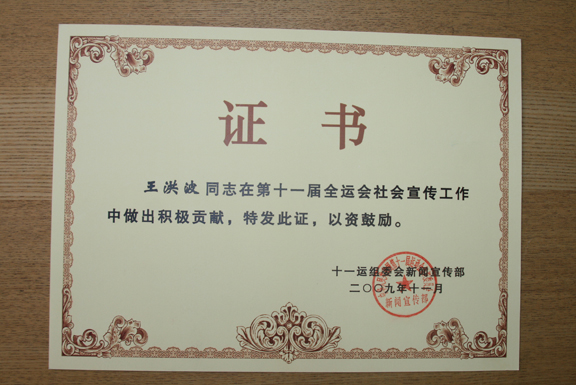 第十一屆全運會組委會新聞宣傳部充分肯定了我校研究生做出的積極工作,分別頒發證書予以鼓勵。
