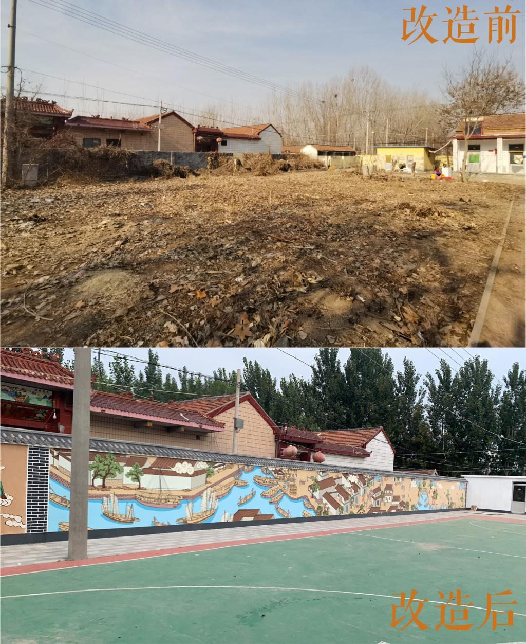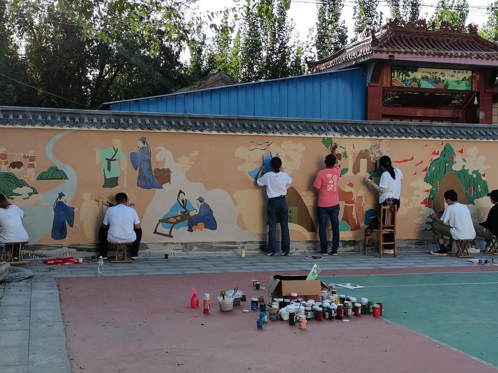 團隊立足鄉村本身,不斷的對剛斧寨村文化進行發掘和整理,做到保護傳承與創新發展相統一。景觀改造設計團隊由我校研究生導師、美術館館長李文華教授為負責人,我校青年教師周振輝及環境藝術設計方向研究生組成,團隊根據剛斧寨村場地現狀和村落風貌,經過數次討論,最終提出對改造場所的圍墻、主體建筑外觀色彩、地面鋪裝、樹池等重要節點的改造方案。基于環境設計的整體性,團隊主動擴大設計范圍,對村落的牌坊、展示牌、廣告牌、健身區及建筑色彩等方面提出改造建議。墻繪團隊由我校研究生導師、造型藝術學院副院長高振堂教授為負責人,藝術學理論、視覺傳達設計、環境藝術設計、數字媒體藝術、攝影等方向研究生組成,團隊根據剛斧寨村村史村志內容,提取了“楊鐵匠為程咬金修鋼斧”、“先有小清河,后有金牛街”、“醫圣劉思孔的傳說”、“剛斧寨錨地”四個有代表性的故事作為主題進行設計,同時為宣傳黨的方針政策、傳播文明新風,設計了黨建主題墻繪。