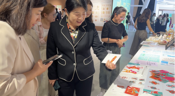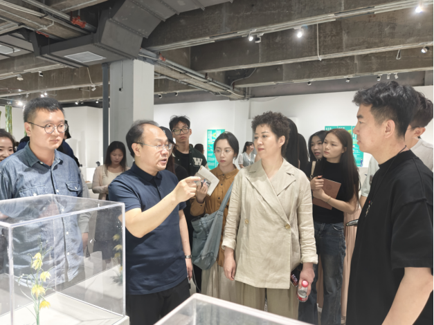 校領導在參觀過程中與導師和研究生親切交流,聽取了同學們關于創作理念、材質技法和作品內涵等方面的介紹,現場體驗了數字交互類作品,對展覽整體情況表示肯定,同時也對進一步辦好展覽,提升展陳及評價方式,提出了具體建議。