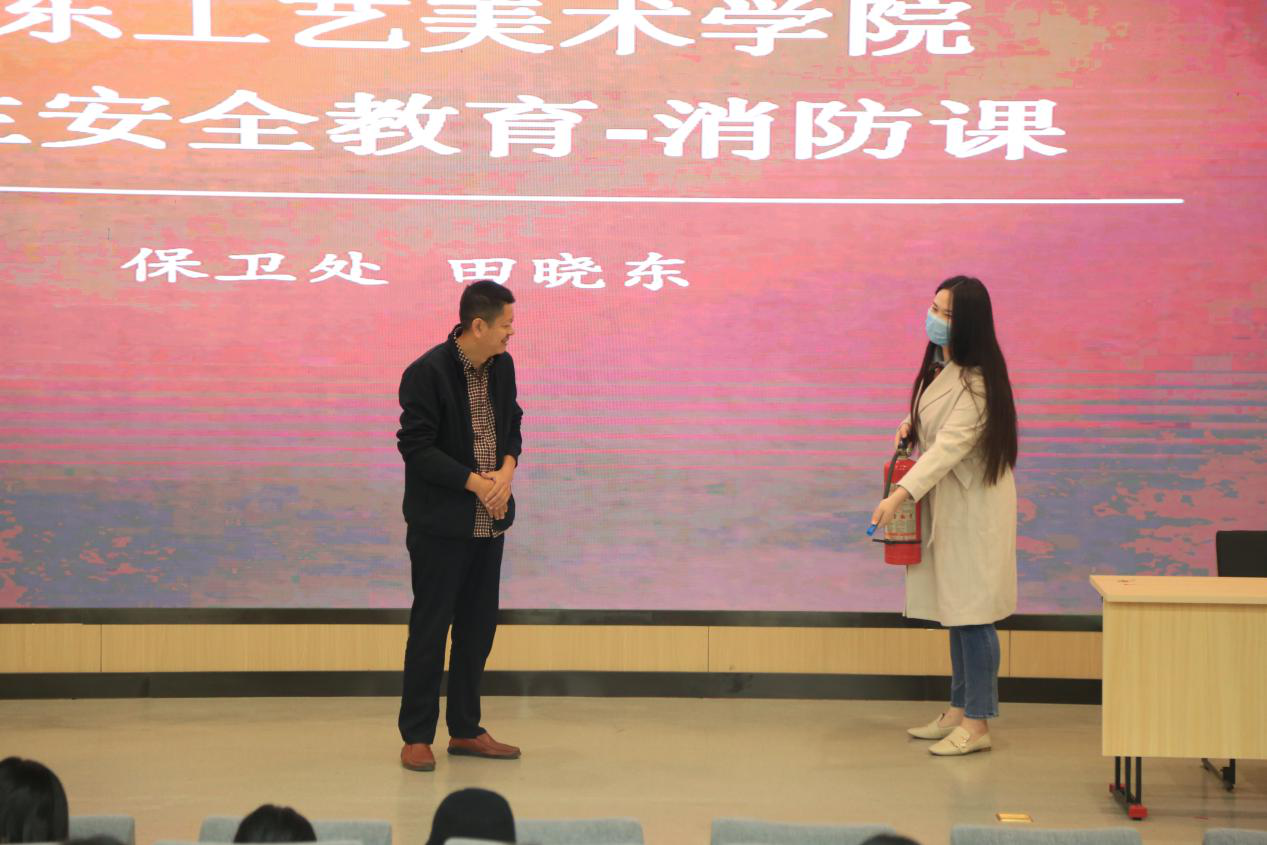 講座緊緊圍繞“如何預防和處理火情”這一主題展開。首先,田科長現場選取了兩名新生代表上臺展示了滅火器的使用流程,并向同學們逐一講解了滅火器使用方法的分解步驟,以這種方式向同學們傳達了最基本地火情處理方式。繼而,講座上田科長為同學們帶來了關于火災傷害的最新視頻案例,大屏幕上展現的一幕幕觸目驚心的火災疫情使得同學們從放松的狀態中緊張起來,一條條鮮活的生命在濃煙滾滾的大火中逝去,正值青春時光卻再不負青春韶華。最后,田科長又從防火、滅火、逃生、自救四個方面對消防安全知識進行了總結,他指出以下四點:一是火災的嚴重危害及消防知識的重要性;二是了解學校的防火重點區域,學校的防火注意事項;三是了解常見公寓火災原因,預防公寓火災的注意事項;四是到公眾聚集場所時應注意的消防安全事項及發生火災時的逃生方法。火災最好的應急處理措施就是要提早預防,防患于未然。