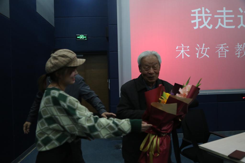活動的最后,學(xué)生黨員代表向宋老先生敬獻(xiàn)鮮花,教師和學(xué)生黨員與宋老先生合影。