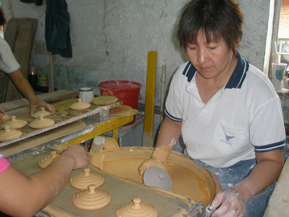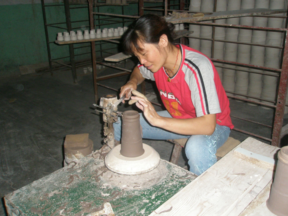 隨后在骨瓷廠負(fù)責(zé)人的帶領(lǐng)和講解下,調(diào)研小組著重對整個陶瓷制造的流程進(jìn)行了考察,從原料選擇、比例配備、釉料粉碎、泥漿稠稀度、模具成型、坯體打磨拋光、附件銜接、上釉補(bǔ)釉、花紙粘貼、入爐烘烤等各個環(huán)節(jié)進(jìn)行了細(xì)致的觀摩和學(xué)習(xí),并不時向工作人員咨詢一些工序的主要細(xì)節(jié),有的同學(xué)按捺不住好奇心,動手操作起來,居然也做的有板有眼。