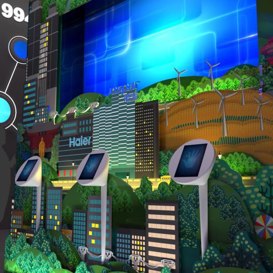 展墻運用山東半島地域風貌,通過山東地方具有代表性的農民畫這一非遺、國際化的綠色環保語言,勾勒出一幅極具趣味性、典型性、系統性的美麗畫卷。觀眾可通過三個IPad觸摸屏里的五款能源小游戲控制展墻上的五組能源光電動感模型,并可觸發中心視頻播放宣傳片,互動趣味性、體驗感強,內容豐富。同時,在展墻前方設置有“能源之旅”VR體驗環節,觀眾可通過虛擬游戲互動,暢游山東大地山川,瀏覽山東綠色能源,體驗山東文化風韻。