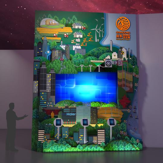 山東活動周臨展區位于中國館的一層,該區域空間有限、人流量大、參觀時間較短,需要展示山東優勢能源從生產到應用的智慧式、系統性全過程,又要突出山東特色、承載豐富內容、巧妙留住觀眾,所以展示設計秉持高效整體、面積最大化的理念,將“畫卷語言”、“立體裝置”、“互動視頻”與“VR虛擬游戲”四種藝術表現形式有機地融合在一面5.5米高、4米寬的立體、多層、互動展墻之上。主要展陳山東5大優勢能源的“智慧生產、智慧調配與智慧應用”。