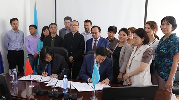 最后,Baurzhan Nurakhmetov校長、苗登宇副書記分別代表學校簽署合作意向書。潘魯生院長與Baurzhan Nurakhmetov校長交換紀念品。