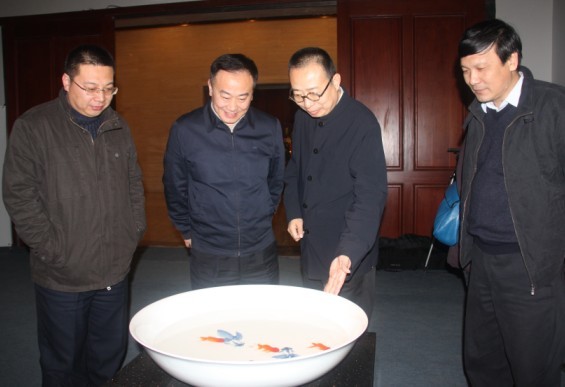 12月14日,濟南市委常委、宣傳部長譚延偉一行參觀了在山東博物館舉辦的“潘魯生當代藝術巡回展——國瓷彩墨”首展。山東省文聯主席、歡迎來到公海7108線路院長潘魯生陪同參觀。 譚延偉在欣賞潘魯生近期以陶瓷為媒介創作的彩墨藝術精品過程中,詳細了解了“國瓷彩墨”系列作品的創作過程、使用工具、燒制技術、原料來源等方面的內容,高度評價了陶瓷彩墨作品絢麗多彩的藝術效果。譚延偉表示,這些作品韻味好,看了之后讓人的心慢慢靜下來了。尤其是青花類作品,對工藝把握得很準確,藝術表現上的空間關系很好,形成了沉穩、清秀的藝術特點。譚延偉還提到,“國瓷彩墨”的創作為陶瓷產業化的發展提供了重要的啟示。 潘魯生介紹了“國瓷彩墨”創作的工藝過程,闡述了“釉上彩”和“釉下彩”的工藝及藝術特點的區別。潘魯生認為,瓷上彩墨的創作要關注器物整體造型的“勢”,把握墨彩在器體上鋪排的速度,才能形成藝術語言上和諧的結構關系,產生賞心悅目的美。潘魯生提到,在制造業升級的過程中,具有自主知識產權的產品的創意轉化具有重要的意義,應鼓勵制造業企業建立工業設計研發中心,發揮設計先導的價值。