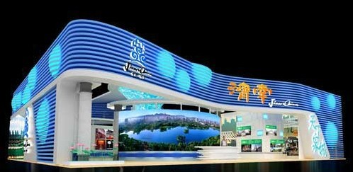 濟南展區面積為500平方米,是十七地市面積最大的展區,以“文化濟南天下泉城”為主題,設計理念圍繞“水”、“城”二字做文章,泉城最有特點的元素就是“泉”與“水”,同時她又是一座有著2600年歷史的古城,濟南歷史底蘊深厚,“天下第一泉”世人皆知,七十二名泉遍布泉城,泉水已成為濟南的靈魂,我們通過各種設計元素,用多元的展示手段來體現古老泉城的新文化概念。藍色為主色調,在視覺上表達“水”的概念。展區為四方形,其中有一面墻為整個濟南市的城市剪影,四周圍繞水的造型,這些水既是泉水,又象征著護城河,主造型體現“水環繞的城市”的設計理念。