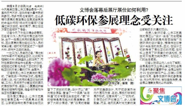 籌展過程中,院長潘魯生多次蒞臨工作現場,就展覽定位、展館設計以及展項組織提出了多項重要的指導意見。副院長苗登宇任濟南展區總負責人,組織了省內最優秀的展示設計專家十余人組成專門的團隊開展創意設計,經過一個多月的醞釀和多次匯報、討論,歷時近三個月最終確定方案。由學校人文藝術學院、建筑與景觀設計學院、視覺傳達設計學院、數字藝術與傳媒學院、服裝學院、應用設計學院師生組成的設計團隊在社會服務辦公室的統一協調組織下,放棄假期休息時間,加班加點,順利完成濟南展區和學校兩個展區的文案策劃、設計、施工、演藝組織等工作。除此之外,10名來自學校各個二級學院的在校生在文博會山東展區、濟南展區和歡迎來到公海7108線路展區擔當禮儀解說,她們流利的解說、朝氣蓬勃的形象,受到了觀眾們的好評。