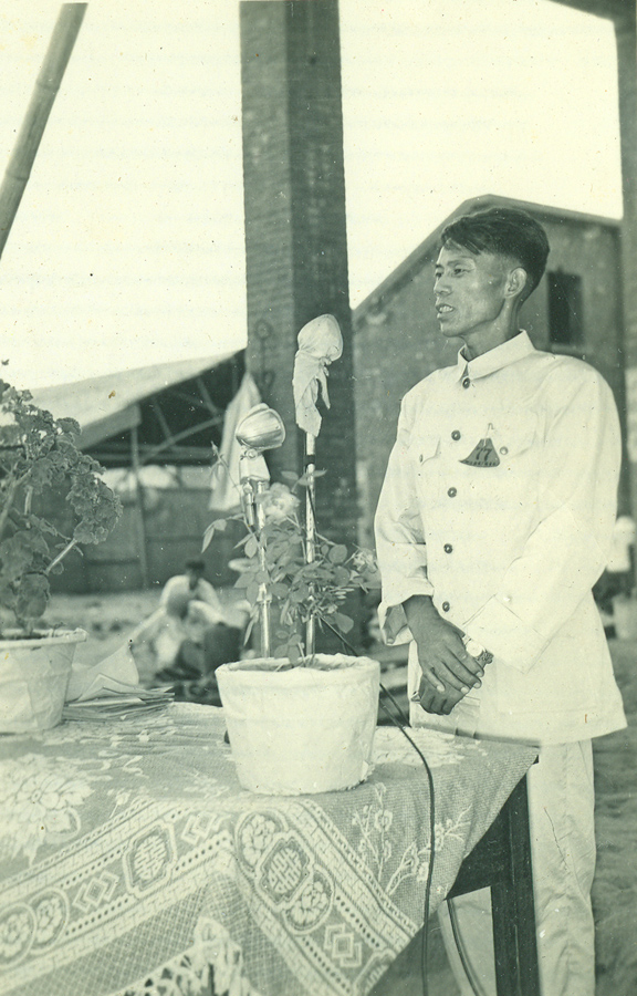 1958年,于煙臺(tái)鋼鐵廠,在第一座高爐投產(chǎn)慶祝大會(huì)上講話