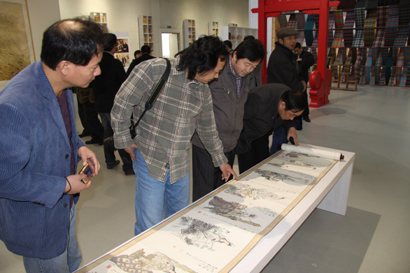 座談開始前,校友們參觀了正在我校美術(shù)館展出的“手藝農(nóng)村——潘魯生主持山東農(nóng)村文化產(chǎn)業(yè)調(diào)研成果展”。參觀過程中,校友們對(duì)調(diào)研和展覽的成果給予了高度評(píng)價(jià),并被展廳內(nèi)濰坊楊家埠年畫、風(fēng)箏,臨沂柳編、紅花鄉(xiāng)中國(guó)結(jié),曹縣桐楊木藝、鄄城土布、巨野農(nóng)民工筆繪畫等展覽展示項(xiàng)目所吸引,不時(shí)合影留念。
