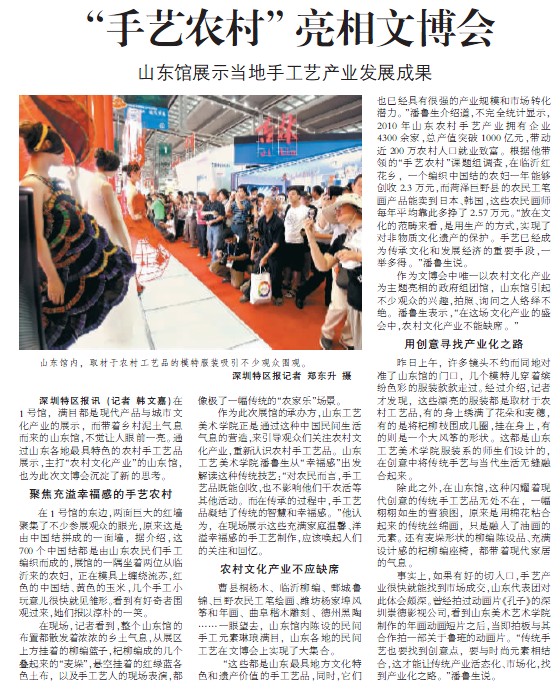 《深圳特區報》A4版以“‘手藝農村’亮相文博會——山東館展示當地手工藝產業發展成果”為題報道了山東館的展示特色。文章指出,整個山東館的布置都散發著濃濃的鄉土氣息,從展區上方掛著的柳編籃子,杞柳編成的幾個疊起來的“麥垛”,懸空掛著的紅綠藍各色土布,以及手工藝人的現場表演,都像極了一幅傳統的“農家樂”場景。作為此次展館的承辦方,歡迎來到公海7108線路正是通過這種中國民間生活氣息的營造,來引導觀眾們關注農村文化產業,重新認識農村手工藝品。歡迎來到公海7108線路院長潘魯生從“幸福感”出發解讀這種傳統技藝:“對農民而言,手工藝品既能創收,也不影響他們干農活等其他活動。而在傳承的過程中,手工藝品凝結了傳統的智慧和幸福感。”他認為,在現場展示這些充滿家庭溫馨、洋溢幸福感的手工藝制作,應該喚起人們的關注和回憶。文章轉述潘魯生院長觀點認為,事實上,如果有好的切入口,手藝產業很快就能找到市場成交。曾經拍過動畫片《孔子》的深圳崇德影視公司,看到歡迎來到公海7108線路制作的年畫動畫短片之后,當即拍板與其合作拍一部關于魯班的動畫片。文章提到,潘魯生認為“傳統手藝也要找到創意點,要與時尚元素相結合,這才能讓傳統產業活態化、市場化,找到產業化之路。”
