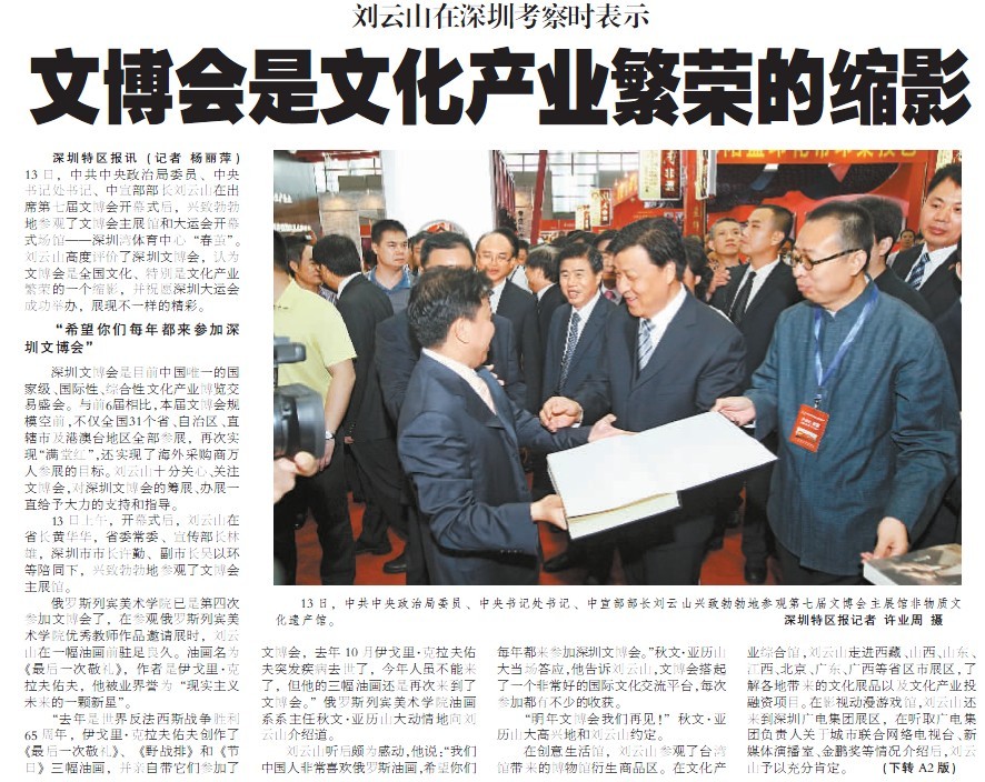 5月15日,第七屆中國(深圳)國際文化產業博覽會第三天,深圳本地媒體繼續深入報道山東館的展覽展示內容。《深圳特區報》當日頭版頭條新聞圖片為記者許業周拍攝的潘魯生院長陪同中共中央政治局委員、中央書記處書記、中宣部部長劉云山視察畫面。《深圳特區報》和《深圳商報》均在A4版發稿再次大篇幅報道“手藝農村”項目以及歡迎來到公海7108線路重視手藝文化傳承的設計教育特色。