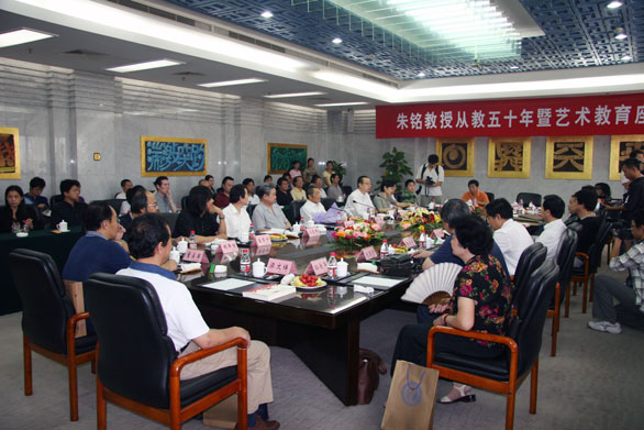 座談會上,與會的專家、學者圍繞朱銘教授從教五十周年及藝術教育主題作自由發言。他們回顧了與朱銘教授之間的師生情誼,就朱銘教授高尚的師德和卓越的學術成就暢所欲言。他們說,朱銘教授在教學崗位上,傳道,授業,解惑,潛心育人,勤勤懇懇,無私奉獻,用扎實的工作和淵博的學識完美地詮釋了一個人民教師的神圣使命;他誨人不倦,堅持不懈地教育學生追求真知、樹立人生理想,是學生的良師益友;他以樸素的信念和高尚的品德,展示了為人師表者最為本真的境界。與會者一致稱贊,朱銘教授作為教師恪盡職守、嚴謹治學、無私奉獻,是為高尚師德的楷模;作為學者求真務實、勇于創新、鍥而不舍,堪稱學者典范;作為長者和藹可親、謙和仁厚、樂觀向上,可謂德之高者。大家紛紛表示要以朱銘教授為榜樣,提高自身的人格魅力和學識魅力,踏實治學,勤勉育人,扎實做好教學和研究工作。