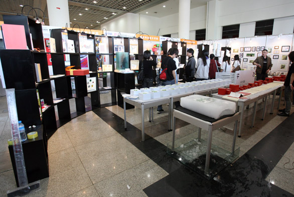對于年輕的學(xué)子來說,充滿求知的激情、探索的困頓和對未來憧憬的大學(xué)階段,無疑是人生中最具理想主義的爛漫年華。古靈精怪的現(xiàn)代創(chuàng)意與完美精工的傳統(tǒng)手藝相結(jié)合,無意是本屆博覽會的一大亮點(diǎn)。這些點(diǎn)子不僅體現(xiàn)在工業(yè)設(shè)計(jì)、裝置藝術(shù)等專業(yè),就是傳統(tǒng)的國畫、油畫、雕塑門類,也呈現(xiàn)出令人耳目一新的感覺。 本屆博覽會延續(xù)“設(shè)計(jì)?生活”的主題,作品貼近生活,引領(lǐng)時(shí)尚,在新材料、新工藝、新技術(shù)的運(yùn)用上有了更大進(jìn)步。除了傳統(tǒng)的繪畫、雕塑等美術(shù)類作品和平面設(shè)計(jì)作品之外,更多地涉及工業(yè)類、建筑類產(chǎn)品模型,陶藝、漆藝、首飾等手工作品,動畫、影視美術(shù)等多媒體設(shè)計(jì)作品。縱觀整個(gè)畢業(yè)展,學(xué)生們嘗試著“給傳統(tǒng)穿新衣”,環(huán)保、創(chuàng)新、反思、希望等是大部分作品的核心主題,學(xué)生們借助多樣的材料和多角度的表達(dá)方式,讓設(shè)計(jì)作品與當(dāng)下社會接軌,與百姓生活密切相關(guān),切實(shí)做到了“設(shè)計(jì)服務(wù)生活,設(shè)計(jì)引領(lǐng)生活。 展會當(dāng)天吸引了大批市民和藝術(shù)愛好者前來獵奇尋寶,他們游走于各展位之間,為各式各樣精美的展品深深吸引,不時(shí)駐足觀看、流連忘返。該校畢業(yè)生在自己的展柜前詳細(xì)介紹作品的創(chuàng)意、特點(diǎn),通過直接的交流使創(chuàng)意、設(shè)計(jì)的理念得到更廣泛的傳播。許多低年級學(xué)生也參加布展工作,并到現(xiàn)場參觀展覽,他們細(xì)心觀看學(xué)長的作品,印證自己專業(yè)的學(xué)習(xí)心得和創(chuàng)作經(jīng)驗(yàn)。感受到觀眾們對學(xué)長作品的喜愛熱情,他們對自己專業(yè)的發(fā)展也更加充滿信心。