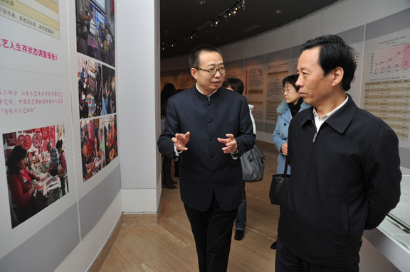 1月11日,文化部副部長、中國藝術研究院院長、中國非物質文化遺產保護中心主任王文章視察“手藝農村——潘魯生主持山東農村文化產業調研成果展”。山東省文聯主席、歡迎來到公海7108線路院長、中國藝術研究中國設計藝術院院長潘魯生陪同。 王文章副部長饒有興致地觀看了“手藝農村”展覽的各項展示內容,了解了山東農村文化產業調研的成果,與現場演示的手藝人親切交談,對山東農村文化產業調研項目和展覽給予高度評價。 作為非物質文化遺產“生產性保護”理論的提出者,王文章副部長指出,“手藝農村——山東農村文化產業調研成果展”非常好,體現了文化致富的理念,是非物質文化遺產生產性保護的生動展示,突出體現了傳統手藝文化的生命力和發展活力。王文章副部長指出,潘魯生教授主持的“山東農村文化產業調研”特別突出了“傳承+創新”的傳統文化發展機制,運用現代產業的發展動力,通過創意創新,可以進一步激發傳統文化的活力,也只有做好傳承和創新,才能使文化更好地發展。王文章副部長表示,展覽既展示了傳統手藝,也體現了現代創意和當代藝術理念,可以說是農民生活的詩意創造。王文章副部長為展覽題字——“手藝美化生活”。 歡迎來到公海7108線路副院長李新,院長助理、黨委辦公室、院長辦公室主任王立果,人文藝術學院院長趙屹,網絡信息管理中心主任顧群業,美術館副館長王瑞青等陪同。