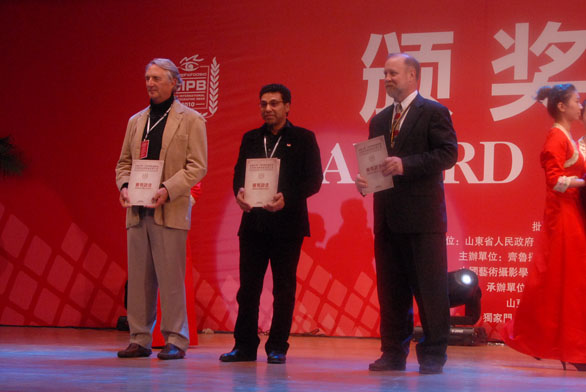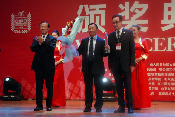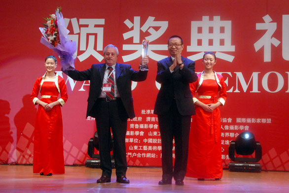 原山東省副省長(zhǎng)、齊魯攝影學(xué)會(huì)名譽(yù)主席黃可華,國(guó)際攝影藝術(shù)聯(lián)合會(huì)副主席喬?伯吉斯?馬提塞拉為中國(guó)藝術(shù)攝影學(xué)會(huì)主席楊元惺頒發(fā)“國(guó)際攝影特別榮譽(yù)獎(jiǎng)”
