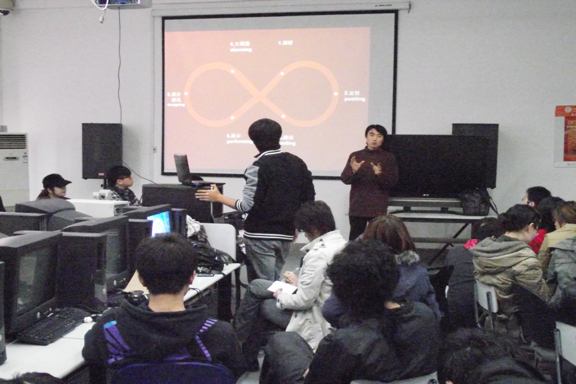 本次“數字藝術與傳媒工作坊”的主要項目是實現在ipod上的應用程序開發。27日上午,由數字媒體藝術教研室田金良老師對項目開發方式進行精簡的介紹,雙方在相互認識后,交流了彼此的學習生活方式,確立了工作坊活動期間的小組劃分,并開始深化對項目的研究。