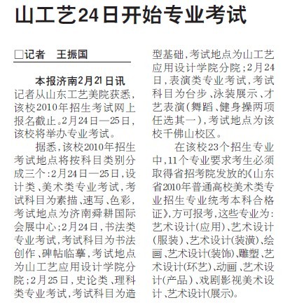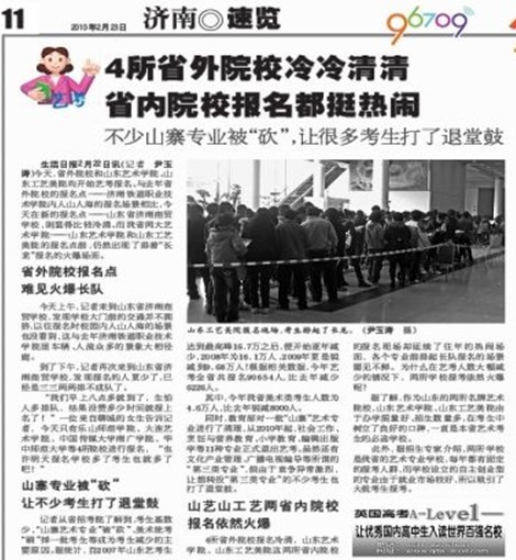 2月22、23日,我校2010年專業招生考試現場報名工作在舜耕國際會展中心順利進行。我校專業招生工作得到了社會各界的廣泛關注,社會媒體紛紛予以采訪報道,各大網站也相繼轉載報道。 新華社山東分社、山東電視臺、山東教育電視臺、齊魯晚報、山東商報、生活日報、濟南日報、濟南時報、都市女報、齊魯周刊等媒體對我校招生報名工作進行了現場采訪。22日山東衛視《山東新聞聯播》、山東教育電視臺《教育新聞》以及《齊魯晚報》等媒體對我校專業招生考試報名首日的情況進行了報道。 各媒體記者深入到報名工作各個環節, 對部分家長、考生、帶隊老師進行了現場采訪,并就相關問題采訪了我校相關負責人、工作人員,了解了此次招生報名工作的具體情況。 報名現場秩序井然、志愿者服務熱情、工作人員嚴謹負責,給媒體記者留下了深刻印象。各媒體記者對我校此次招生考試現場報名工作給予了很高的評價。