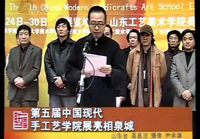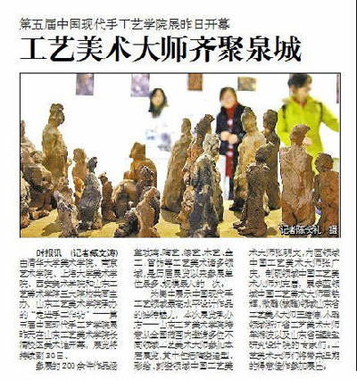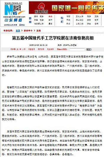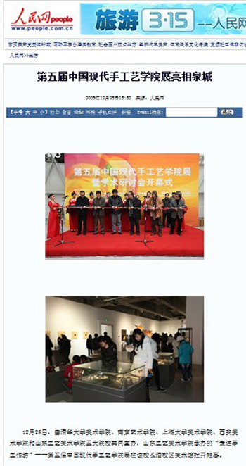 由清華大學美術學院、南京藝術學院、上海大學美術學院、西安美術學院和歡迎來到公海7108線路五大院校共同主辦,歡迎來到公海7108線路承辦的“走進手工作坊”——第五屆中國現代手工藝學院展已于12月25日在我校長清校區美術館隆重開幕。 展覽不僅得到教育界、文化界、藝術界的大力支持,也得到社會媒體的廣泛關注。25日上午,新華社山東分社、中新社山東分社、山東人民廣播電臺、山東電視臺、山東教育電視臺、中國文化報、大眾日報、齊魯晚報、山東商報、生活日報、都市女報、濟南日報、濟南時報、城色雜志、人民網、大眾網等十余家媒體記者參加開幕式并參觀展覽。 12月25日山東衛視《山東新聞聯播》節目,以“第五屆中國現代手工藝學院展亮相泉城“為題對展覽盛況進行報道;當日,人民網、新華網網絡首發活動新聞。26日晚,山東教育電視臺《教育新聞》節目頭條播報展覽情況。25日《齊魯晚報》、《生活日報》、《濟南時報》、《濟南日報》、28日《都市女報》、29日《山東商報》分別刊登了對展覽活動情況的報道。后期,城色雜志將對活動進行情況專題報道。 第五屆中國現代手工藝學院展旨在弘揚中國手工藝術傳統與現代手工藝術交流,推動高校現代手工藝術教學的長遠發展。參展的200余件作品涵蓋玻璃、陶藝、漆藝、木藝、金工、首飾等工藝美術諸多領域,是歷屆展覽以來參展單位最多、規模最大的一次。作品都來自實踐教學工作室或手工作坊,是各學院師生實踐教學的最新成果,既時尚又有創意,是傳承手工藝、提高學生動手能力的集中展示。