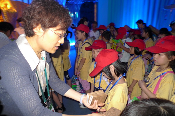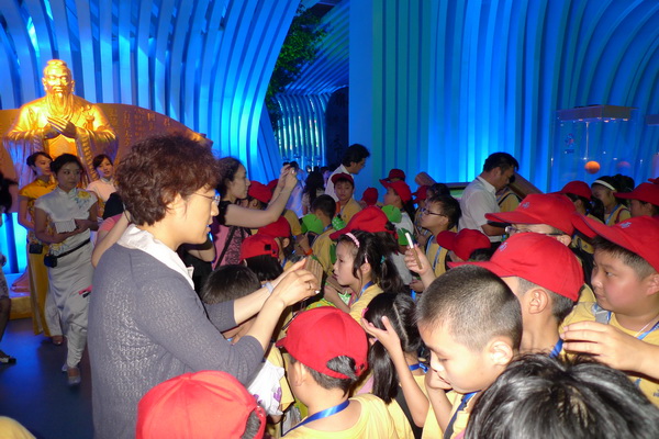 日前,山東館執行副館長、我院副院長新主持了向中小學生贈送《論語百句》活動,在山東館向來自武漢實驗外國語學校的百余名小學生贈書,并贈送了銀杏涼扇等紀念品。贈書活動受到廣大學生歡迎,小涼扇等紀念品也充分體現了對盛夏觀展的孩子們的關愛。李新副院長表示,展覽活動的一項重要意義在于促進文化交流與傳播,其中,面向孩子們的交流,作用最長遠,希望通過世博會這個窗口,孩子們能更好地學習新知識,更好地開闊眼界,爭取成長為具有深厚文化基礎和創新精神的一代人。