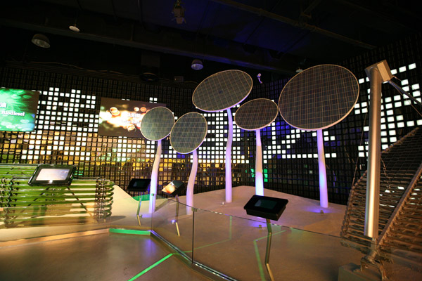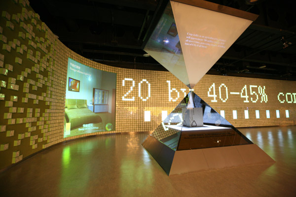 在本屆世博會(huì)的城市主題中,暢想未來生活,“低碳”、“環(huán)保”、“和諧”的理念尤為突出。一方面,科技應(yīng)成為人際和諧的橋梁,促進(jìn)心靈的聯(lián)接;科技應(yīng)著眼低碳、環(huán)保,實(shí)現(xiàn)生態(tài)與人文的和諧美好。另一方面,人們應(yīng)當(dāng)真正樹立和諧生活的理念,充滿關(guān)于低碳、環(huán)保、生態(tài)和諧的美好期望。因此,中國(guó)國(guó)家館以“低碳行動(dòng)”為獨(dú)立展區(qū),通過風(fēng)能、太陽能、微藻制油等裝置模型,展示以低碳為核心元素的未來發(fā)展理念,強(qiáng)調(diào)“取之有道”,倡導(dǎo)“師法自然”,力求應(yīng)對(duì)未來的城市化挑戰(zhàn),為實(shí)現(xiàn)全球可持續(xù)發(fā)展提供“中國(guó)式的回答”,并在觀展的最后一站,營(yíng)建“新九洲清晏”的自然景觀,運(yùn)用中國(guó)傳統(tǒng)園林和現(xiàn)代造景技術(shù),體現(xiàn)自然生態(tài)和東方神韻,使關(guān)于未來生活的暢想充滿無窮韻味。地區(qū)館關(guān)于未來生活的理念也落腳于“低碳”“環(huán)保”主題,關(guān)注人文與生態(tài)的和諧。例如,山東館展示了自主品牌的物聯(lián)網(wǎng)冰箱、無水或無洗衣粉洗衣機(jī)、世界首臺(tái)無尾電視等先進(jìn)環(huán)保產(chǎn)品,并運(yùn)用了無土栽培技術(shù)和信息互動(dòng)平臺(tái),展示生態(tài)和科技的“花如意”,寓意生活如畫、如詩、如意。天津館設(shè)有生態(tài)環(huán)保展廳,突出宣傳生態(tài)宜居高地建設(shè),重點(diǎn)展示中新生態(tài)城、循環(huán)經(jīng)濟(jì)示范項(xiàng)目等內(nèi)容。湖南館詮釋未來城市形態(tài),由生態(tài)環(huán)保、環(huán)境宜人、能源可循環(huán)利用、可持續(xù)發(fā)展的未來環(huán)節(jié),演繹“都市桃花源”主題。江西館以“生態(tài)”為切入點(diǎn),集中展示“生態(tài)風(fēng)光、生態(tài)工程、生態(tài)城市”景觀,展示人與自然和諧相處的新生活。西藏館以“保護(hù)生態(tài)環(huán)境,傳承民族文化,創(chuàng)造美滿生活,促進(jìn)可持續(xù)發(fā)展”為展示理念,展示“新西藏、新發(fā)展、新生活、新變化”。
