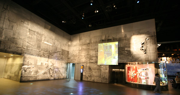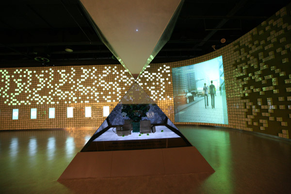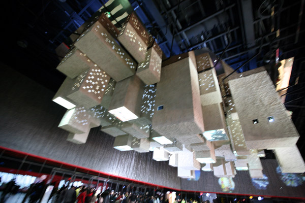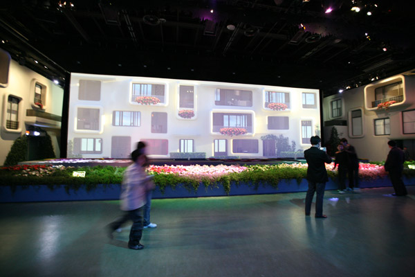 從展項(xiàng)設(shè)計(jì)看,運(yùn)用多媒體技術(shù),以影像形式記錄梳理發(fā)展脈絡(luò),是主要的展示手段。例如,國(guó)家館通過前、左、右三面大銀幕,在不同的空間播放同時(shí)主題影片,如 “微型史詩”,展現(xiàn)當(dāng)代中國(guó)家庭生活與城市建設(shè)的變遷發(fā)展。山東館的魯班鎖運(yùn)用卯榫智慧和尖端顯示技術(shù),將2100多塊LED管束模塊組裝、拼接、連線、總控集成,于巧妙構(gòu)型中演映不同主題視頻,變換光影效果。浙江館“青瓷碗”造型的影像裝置,輔以水波漫溢的形態(tài),投影展示浙江的自然風(fēng)光與發(fā)展成果。上海館以動(dòng)感影院形式,模擬不同交通工具駕乘感受,使觀者于行走間瀏覽城市變遷,體驗(yàn)上海“永遠(yuǎn)的新天地”。應(yīng)該說,多媒體技術(shù)、影像語言在中國(guó)國(guó)家館及省區(qū)市館得到了最為普遍的應(yīng)用,成為本次展示活動(dòng)最主要的設(shè)計(jì)語言。某種程度上,也反映了繼北京奧運(yùn)開幕式創(chuàng)造性地運(yùn)用影像語言之后,中國(guó)當(dāng)代設(shè)計(jì)領(lǐng)域?qū)τ谟跋裾故臼侄蔚囊?guī)模化應(yīng)用,具有時(shí)代特點(diǎn)。同時(shí),陳設(shè)性展示依然是主要的展示形式,不同之處在于展品、展項(xiàng)的文化信息含量及其所蘊(yùn)含的啟迪空間。例如,中國(guó)國(guó)家館通過“童心暢想”兒童畫的展示,提供了富于沖擊力的審美空間和思考主題。諸多地方展館展示了珍貴的出土文物和民間工藝品,體現(xiàn)了文化遺產(chǎn)與城市發(fā)展之間的聯(lián)系與思考。此外,營(yíng)造體驗(yàn)環(huán)境是重要的展示內(nèi)容,也是主要的展示手段,形成的意境、傳達(dá)的主題,也富于形式的沖擊力。例如,中國(guó)國(guó)家館里“水”的意象貫穿始終,形態(tài)各異,既是意境的凝練,也與現(xiàn)實(shí)的水資源問題相呼應(yīng);“意象竹林”則是對(duì)審美的、詩意生活的境界的營(yíng)造。