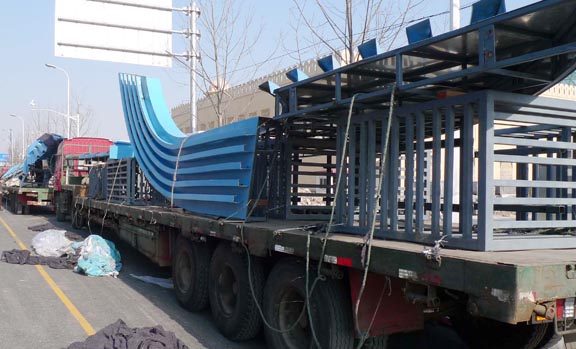 2月20日晚十點,經過十二個小時的長途跋涉,跨越千余公里,在山東省公安廳隨行護送,以及沿途交警部門與上海交警部門的配合下,由山東省交運集團代運的世博會山東館第三批框架,一行十輛十七米的特裝貨車,自濟至滬,通過嚴格安檢,進入世博園中國館區。