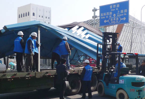 2月21日一早,迅速辦理完手續后,世博園區物流人員將所有貨物卸裝到山東館指定位置,并馬上投入現場搭建安裝。