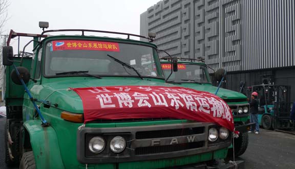 2月26日,世博會山東館第四批貨物,包括部分框架、展品展項、多媒體顯示設(shè)備、照明燈具等共六輛卡車,在山東省公安廳干警的隨行護(hù)送下,從濟(jì)南起運于晚上八點順利到達(dá)上海入世博園中國館區(qū)。