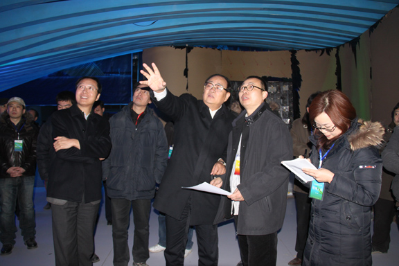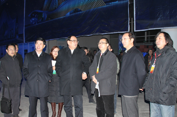我校世博會山東館項目部副總指揮郭去塵、韓文濤,文案與展品展項組組長孫磊、設計組組長王延羽、工程組組長張震、影視組組長韓青等項目負責人員也陪同視察。