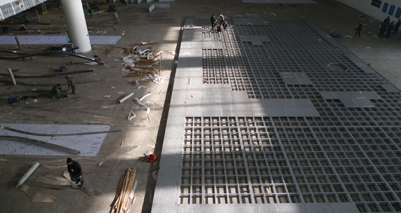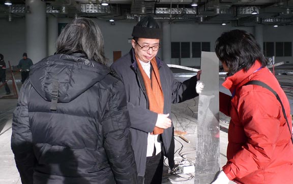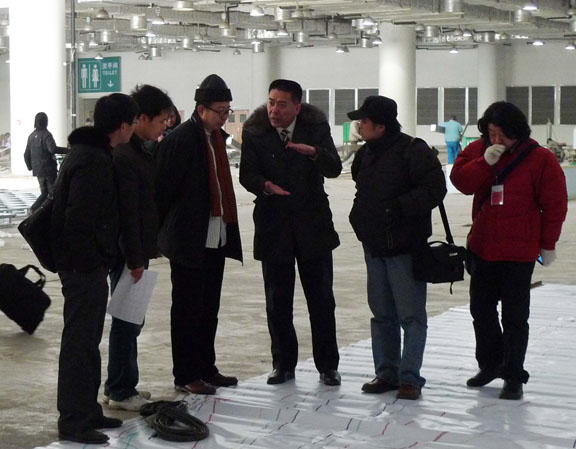 院長召開了現(xiàn)場工作協(xié)調(diào)會。潘院長首先代表學校對各單位的辛勤工作表示感謝,并指出:一,省委省政府高度重視世博會山東館的建設情況,1月15日在濟搭建完成是一項必須保質(zhì)保量完成的重要的政治任務;二,山東館的外形藝術效果獨特,要在設計的基礎上,以雕塑的精細度在實施過程中以一貫之;三,地臺鋪設、綜合布線、照明效果、框架制作、施工監(jiān)理等各個部分,要合理配合;四,框架結(jié)構(gòu)、強弱電線路等工作,要以安全為第一要務。
