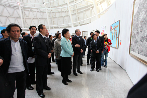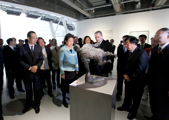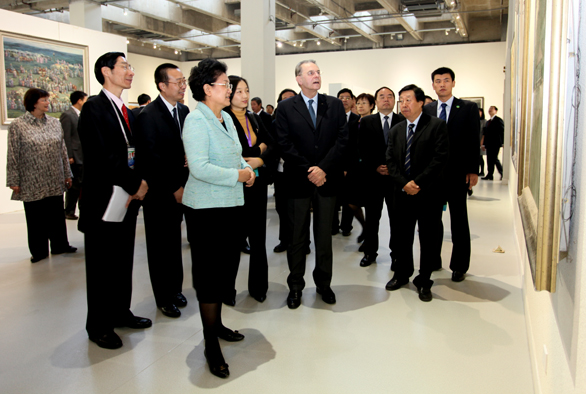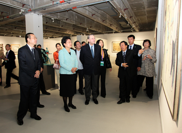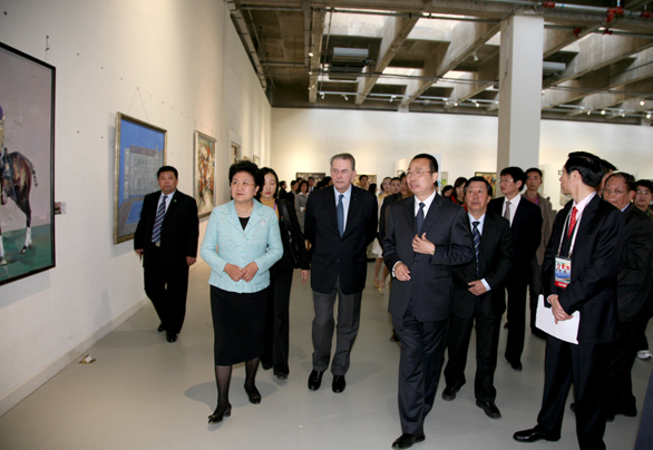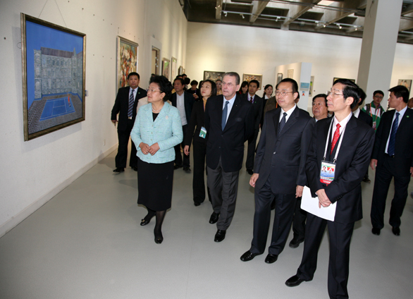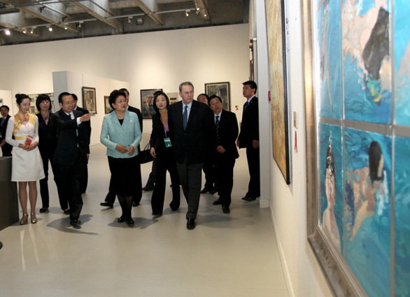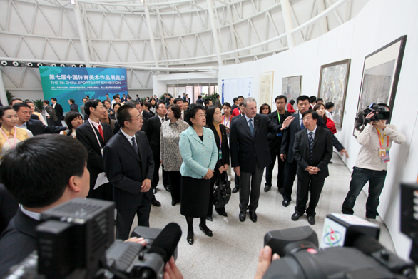 在美術館,劉延東國務委員、羅格主席一行參觀了展覽展出的雕塑、油畫、國畫、版畫、漆畫、招貼畫、水彩畫和粉畫等多種形式和體裁的優秀美術作品,并對獲獎作品給予高度評價,認為獲獎作品不僅體現了“和諧中國 全民全運”的宗旨,同時展示了體育運動“更快、更高、更強”的奧林匹克精神追求,是新中國成立以來體育美術創作水平的又一次集中檢閱。