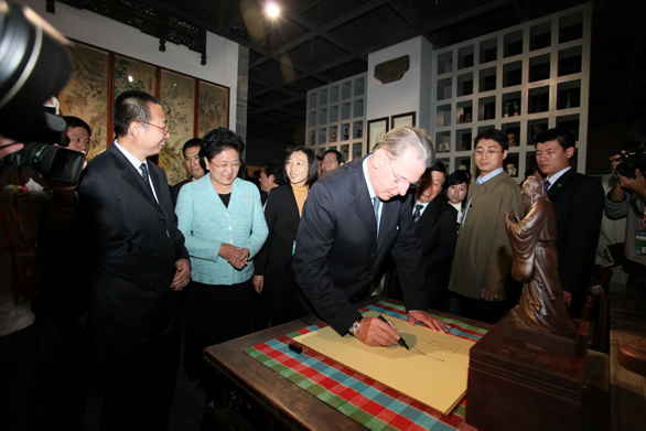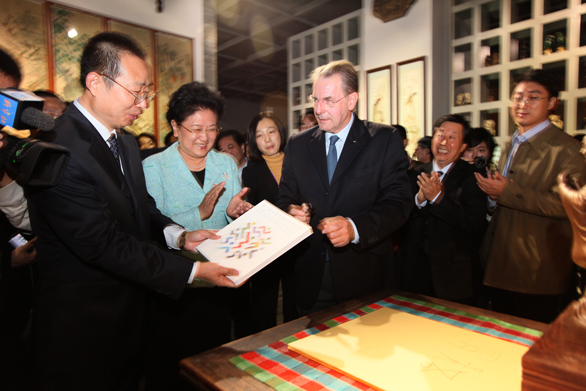 潘魯生院長向國際奧委會主席雅克·羅格贈送孔子雕像與第七屆中國體育美術展覽作品畫冊