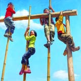 第七屆全國體育美展創作者在關注競技體育的同時,更加重視全民健身觀念的傳播,這既是他們創作理念的源泉,也是創作選擇的重要題材。如國畫《全民全運》不僅作品名稱對應主題,且以組畫的形式展現了平民百姓打籃球、沙灘排球、羽毛球、乒乓球、臺球及雙杠、摔跤、太極拳、踢毽子等運動項目,畫面上隨意輕松的運動場面正是對全民健身的再現。一些富有中國特色的民間體育運動如踢毽子、跳繩、拿大頂、賽龍舟、跳房子、舞龍燈、抬閣等民間游藝、競技、娛玩等題材在美展作品里得以體現。國畫作品《健身舞》(呂幼綱)以鮮明的形式感展現了余杭居民開展扇子舞、太極拳、扭秧歌等群眾體育活動的紅火景象,雖然選題不大,但體現的是全民全運的大主題。令人感動的還有那些反映偏遠地區、以兒童運動為主題的作品,油畫作品《攀》(朱利民)、招貼設計《成長·跨越》(唐家路)等作品都展現了孩子們健身運動的精神和堅守體育文化的力量。瑜伽、輪滑、街舞、呼啦圈、健美操、滑板、沖浪等項目反映了當代中國人的時尚運動理念,而以體育健身益智,反映文明社區建設、和諧城市新貌的體育作品也具有平中見奇的藝術創新。如國畫作品《沙場·球場》(許浩)、水彩畫《門球手》(肖雨、錢庫)展現了老年人在嚴冬和盛夏時節打門球的情景,同時也是幸福環境下老有所樂的體現。從藝術風格和創作語言來看,第七屆中國體育美展呈現了一種風格多樣、語言清新、時代感強的藝術風貌,形式語言獨到,材料選擇多樣。國畫作品《陽光總在風雨后》(張耀明)、《逐》(盧曉峰),已經脫離了傳統筆墨的程式,通過平涂或點染等方式來塑造形象,墨色與紙張材料揮灑了一種新的視覺樣式,作品具有較強的現代意味。