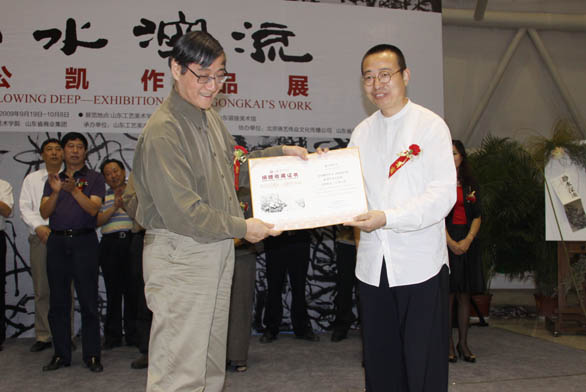 9月18日晚,《靜水深流——潘公凱作品展》作品捐贈儀式在我校長清校區美術館舉行。中央美術學院院長潘公凱先生,潘公凱先生的夫人、杭州畫院副院長、杭州市美術家協會副主席勵國儀女士,中央美術學院美術館館長王璜生,中央美術學院發展規劃辦公室主任謝小凡,中國藝術研究院研究員水天中,中國藝術研究院美術研究所研究員劉驍純,中國美術館研究館員徐虹,日本東洋美術學院教授關乃平,中央電視臺文藝頻道蔡小敏,北京萬博企劃文化有限公司周蓮,香港資深收藏家黃順民,山東畫院院長劉寶純,山東省文聯副主席、山東藝術學院院長張志民,歡迎來到公海7108線路國畫研究院院長郭志光,山東銀座美術館館長田俊,北京德藝偉業文化傳播公司董事長翟君,舜耕山莊經理王長詠出席捐贈儀式。我校黨委書記于茂陽,省文聯主席、我校院長潘魯生,黨委副書記、紀委書記李世平,黨委副書記楊新力,副院長王秀存、李新、刁在祥、張云龍,院長助理、黨辦院辦主任王立果出席捐贈儀式。捐贈儀式由我校副院長李新主持。 我校黨委書記于茂陽同志為捐贈儀式致辭。他代表學校向出席活動的來賓表示歡迎,對潘公凱先生向學校捐贈大作表示感謝。他指出,《靜水深流——潘公凱作品展》是促進藝術交流的重要學術活動,也是山東文化藝術界的一件盛事,預祝展覽和學術研討會圓滿成功。 中國藝術研究院研究員水天中先生講話。他講到,潘公凱先生的捐贈行為,表現了一種薪火相傳的文化圣職,令人感到鼓舞。他預祝從事藝術創作的同志們藝術進步。 中央美術學院院長潘公凱先生講話。他對主辦單位為展覽所付出的辛苦勞動表示感謝。他指出,我校近幾年的發展為社會所矚目,有機會在我校舉辦個人展覽,借此切磋討論中國畫發展問題和中國水墨畫發展前景,是一件非常值得高興的事情。中國畫的發展不僅是中國畫家的事情,也是中國美術界共同關注的大話題,希望通過學術交流對這一話題的研究更為深入。 隨后,潘公凱先生向我校捐贈作品及畫冊,潘魯生院長代表學院接受捐贈。潘魯生院長向潘公凱先生頒發捐贈證書。 捐贈儀式后,與會專家學者和我校師生共同參觀展覽,并參觀我校民藝博物館。其間,潘公凱先生和潘魯生院長分別接受了中央電視臺記者的采訪。