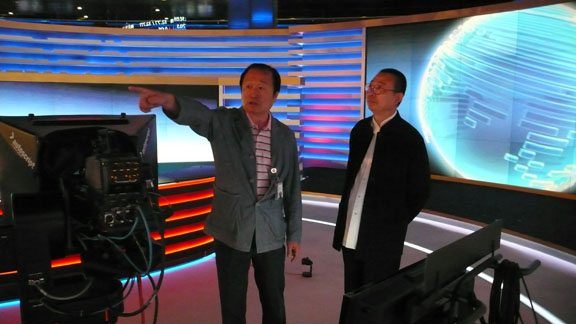 院長在鳳凰衛(wèi)視執(zhí)行副總裁、中文臺臺長王紀言陪同下考察鳳凰衛(wèi)視新直播間