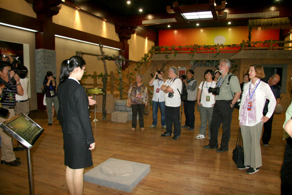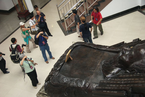 下午采風(fēng)活動正式開始。攝影大師們來到了墨子紀念館和墨硯館。墨子紀念館外的龍泉塔以及館內(nèi)的墨子講學(xué)石雕胸像、《墨子》石刻、名人題詞碑刻等成為大師們采風(fēng)的主要對象;館內(nèi)富有中國傳統(tǒng)建筑特色的角樓、回廊、目夷亭等現(xiàn)代化與民族形式相結(jié)合的園林建筑群體,自然也成為大師們拍攝的對象;“墨子時空觀”、“小孔成像”演示廳,中國四大名硯——端硯、洮硯、歙硯、澄泥硯引起了大師們的極大興趣,不絕于耳的相機快門聲反映了大師們對中國傳統(tǒng)文化的熱愛之情。墨子的科技、軍事成果,中國傳統(tǒng)軍事防御武器云梯、撞車、連弩之車、渠答、火摔、懸脾以及“宋國首都——宋城”等更為吸引大師們的眼球,他們紛紛合影留念,用相機記錄下自己的滕州之行。此時的他們已不只是攝影大師,而成為中國傳統(tǒng)文化的追隨者和傳播者,中華民族的傳統(tǒng)文化將借助攝影大師們的鏡頭宏揚至世界各地。
