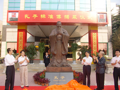 歷時9個多月,備受世人關注的孔子標準像,在孔子誕辰2557年祭孔大典的前夕,于孔子故里曲阜揭幕。最終定稿的孔子標準像為255.7厘米的青銅圓雕。中共山東省委宣傳部副部長徐向紅,中國孔子基金會副理事長兼秘書長張樹驊,山東省工藝美術學院院長