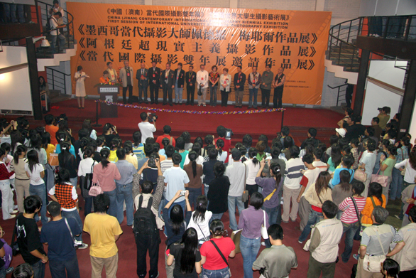 9月26日,由我校、中國攝影學會、中共濟南市委宣傳部聯合主辦的“中國(濟南)當代國際攝影雙年展”暨“首屆世界大學生攝影藝術展”的重要活動之一——“當代國際攝影大師作品邀請展”在山東東方現代藝術館開幕。副院長李新主持開幕式。中國藝術攝影學會會長劉雷為開幕式致詞。美國聯系新聞圖片社總裁羅伯特?普雷基、無國界攝影組織副主席比利奧?尼克爾、墨西哥攝影委員會主席佩德羅?梅耶爾、著名旅美攝影家李振盛以及來自美國、意大利、阿根廷、韓國、日本及中國臺灣、香港、澳門等國家和地區的著名攝影大師出席開幕式。中國藝術攝影學會會長劉雷、美國聯系新聞圖片社總裁羅伯特?普雷基、無國界攝影組織副主席比利奧?尼克爾、阿根廷布宜諾斯攝影協會主席尼科拉斯、意大利著名攝影家里諾?吉多尼等嘉賓為開幕式剪彩。