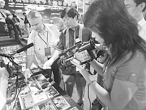 圖為國際評委在媒體的鏡頭前公開評選優秀攝影作品。