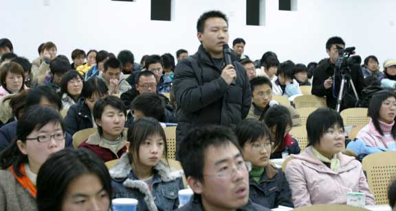 有同學提出純藝術專業的發展前景是怎樣的,學生就業如何定位。潘院長回答說,我院的專業設置都是與社會需求相適應的。他說,隨著我國經濟的快速發展以及各文化領域的蓬勃興起,藝術在社會上的需求量日益增大,且發揮著越來越重要的作用。我院在發展過程中始終堅持“以藝術學科為主體,工科、文科兩翼發展”的指導思想,以培養具有“科學精神、人文素養、藝術創新、技術能力”的高素質人才為目標,為社會培養了一大批緊缺人才。要在社會就業中有競爭力,在社會上有所建樹,關鍵在于同學們要打下堅實的基礎,將自己準確定位,并與社會和市場做好有效對接。